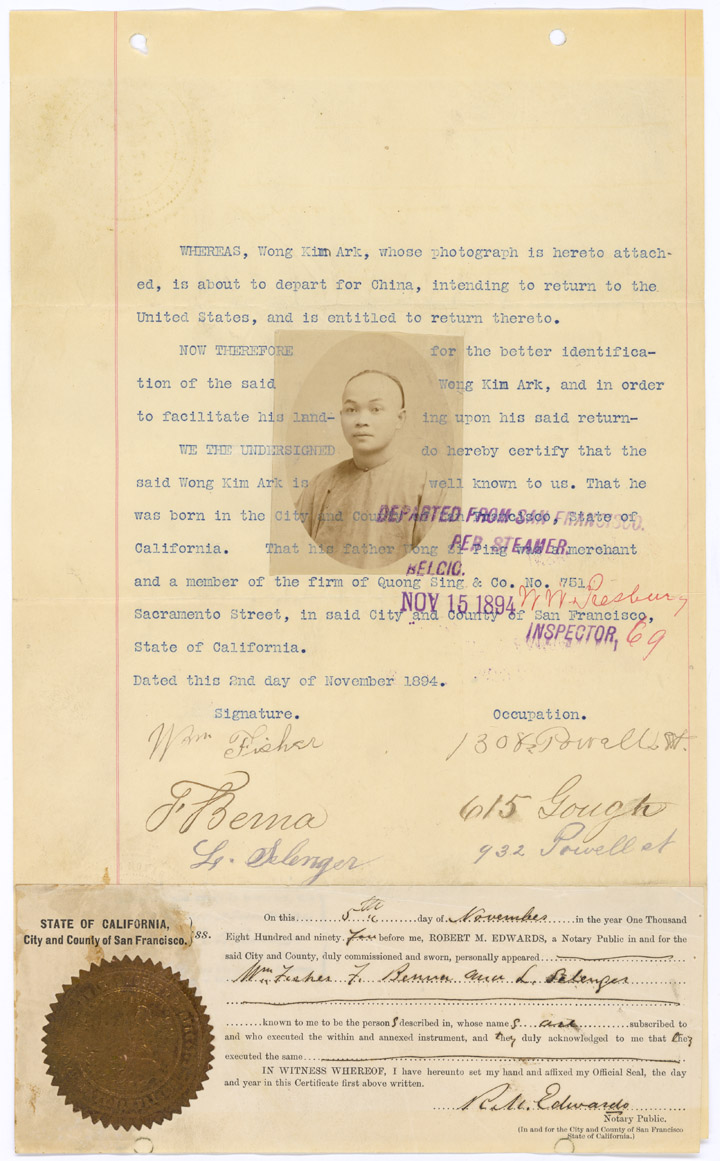This departure statement from 1894 details Wong Kim Ark's plan to visit China and return to the United States. Three individuals signed the statement attesting to his identity and it was notarized by Robert M. Edwards.