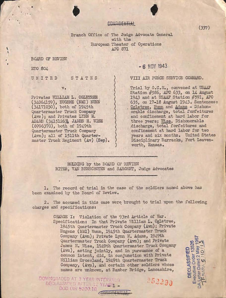 Below is a page from an Army General Court Martial. This series contains records of General Courts Martial, as well as records of Special Courts Martial that resulted in bad conduct discharges from military service. The records were compiled by the War Department, Office of the Judge Advocate General, 1884–September 18, 1947. The page below is from the record of the proceedings of the General Court Martial recounting the Battle of Bamber Bridge.