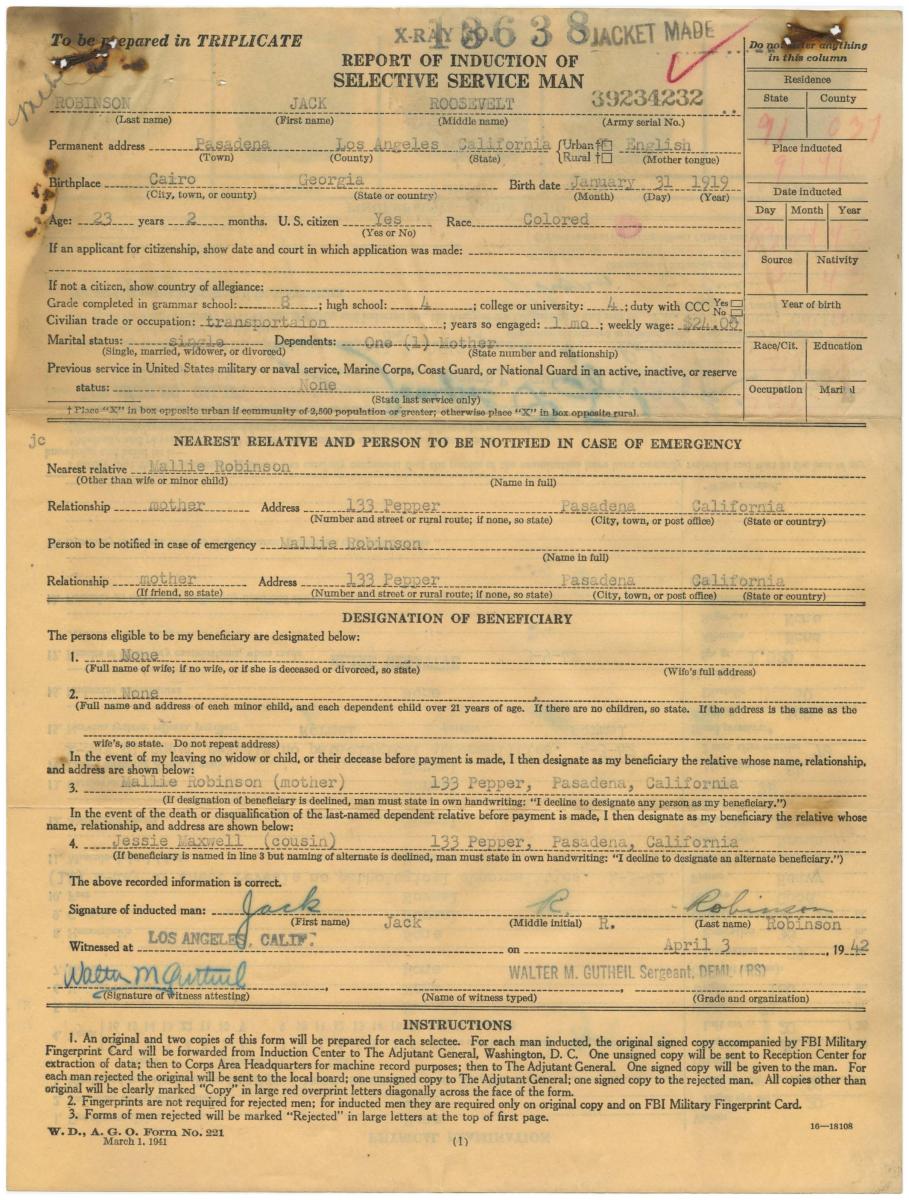 Below is a page from an Army Official Military Personnel File (OMPF) belonging to Jack Roosevelt Robinson, better known as Jackie Robinson. Robinson was the Hall of Fame baseball player whose signing by the Brooklyn Dodgers heralded the end of racial segregation in Major League Baseball. Robinson was inducted into the Army on April 3, 1942. His Official Military Personnel File (OMPF) is considered a Persons of Exceptional Prominence (PEP) file. Persons of Exceptional Prominence (PEP) records consist of military heroes, political leaders, cultural figures, celebrities, and entertainers which are now open to the public.