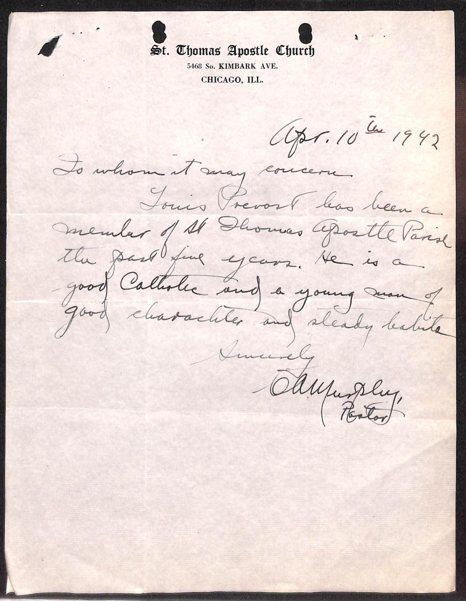 Louis Marius Prevost, father of Pope Leo XIV (born Robert Francis Prevost), enlisted in the United States Navy in 1942. He served through World War II and retired from the Naval Reserve in 1956. The below page from his Officer Official Military Personnel File (OMPF), written by Pastor Murphy of the St. Thomas Apostle Church, describes Louis Prevost as “...a good Catholic and a young man of good character and steady habits.”