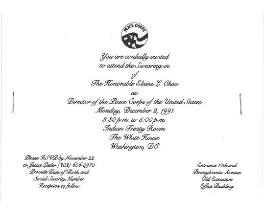 [Chao, Elaine] Invitation to Her Swearing-In Ceremony on December 2, 1991