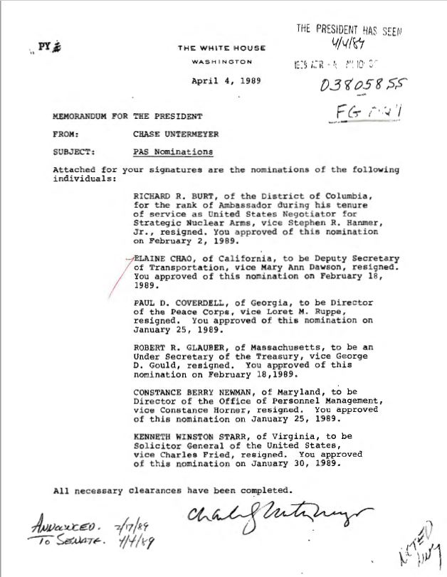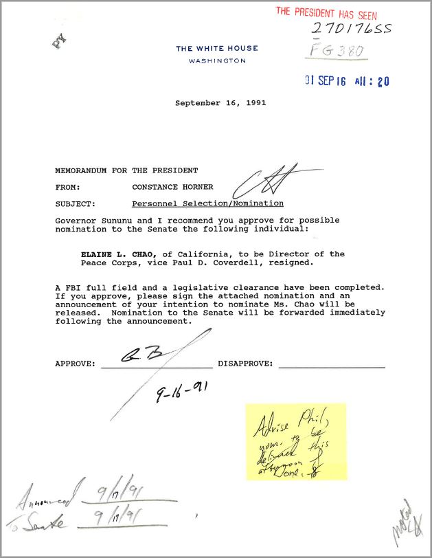 Elaine Chao, then of California, was first nominated to be Deputy Secretary of Transportation in April of 1989. In September of 1991 she was nominated to become the 12 th Director of the Peace Corps. She was the first Asian-American to fill either of these roles. Secretary Chao later served as Secretary of Labor for the George W. Bush administration and is the current Secretary of Transportation.-from the George Bush Presidential Library