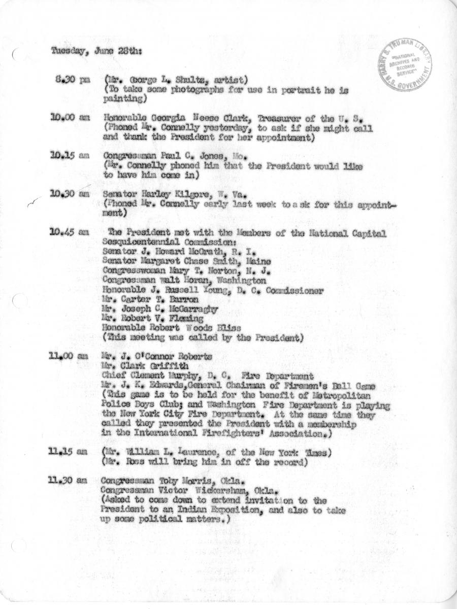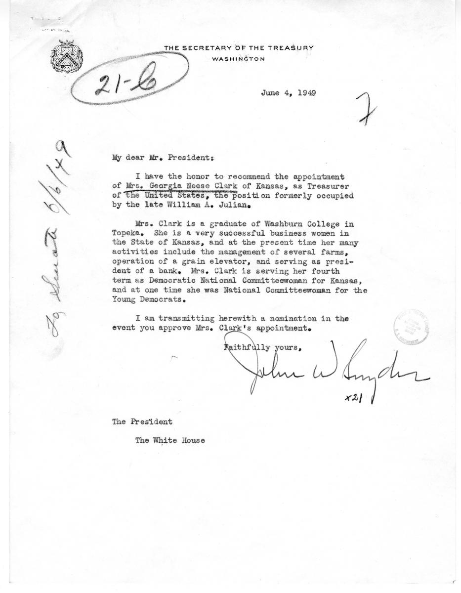 Georgia Neese Clark, of Kansas, was the first woman named as Treasurer of the United States. She majored in economics at Washburn University, and worked at her father's bank in Richland, Kansas. After her father's death, she became President of the bank and inherited other businesses owned by her father. She served as a Democratic National Committeewoman from Kansas, and was a strong supporter of President Truman. That support, and the support from India Edwards, the head of the Women's Division of the Democratic National Committee, helped Ms. Clark receive the nomination from President Truman for Treasurer of the United States. Ms. Clark remained a close family friend of the Trumans in their post-presidential years. Since Ms. Clark, every Treasurer of the United States has been a woman.