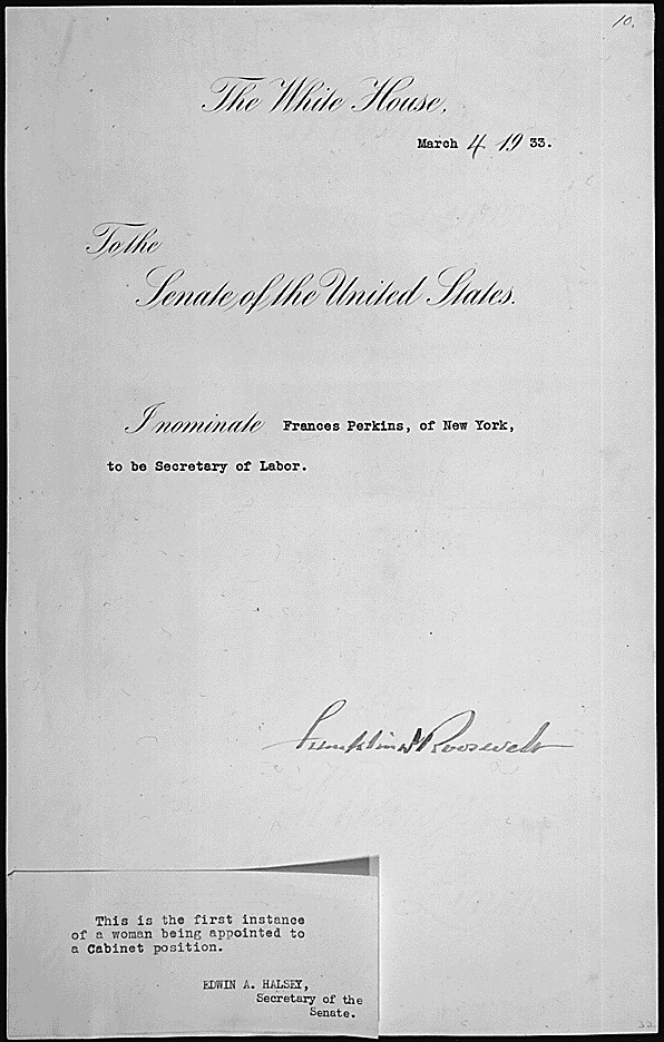 Message of President Franklin Roosevelt nominating Frances Perkins of New York to be Secretary of Labor