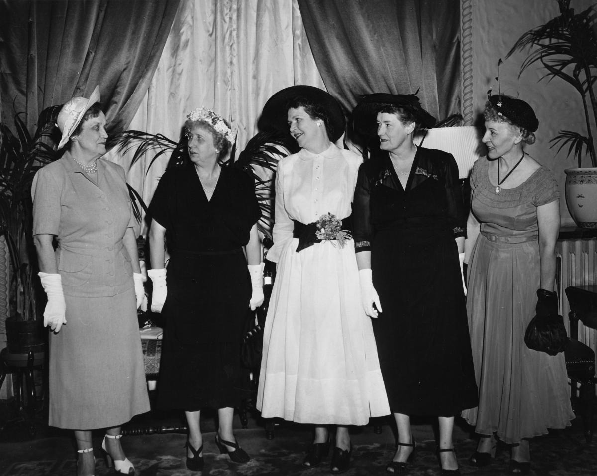 First Lady Mrs. Bess W. Truman with various women Democratic Party leaders. From left to right: United States Ambassador to Luxembourg Perle Mesta, Mrs. Truman, Treasurer of the United States Mrs. Georgia Neese Clark, Democratic National Committee Vice-Chair India Edwards, and Mrs. Gladys Avery Tillett. ca.1950