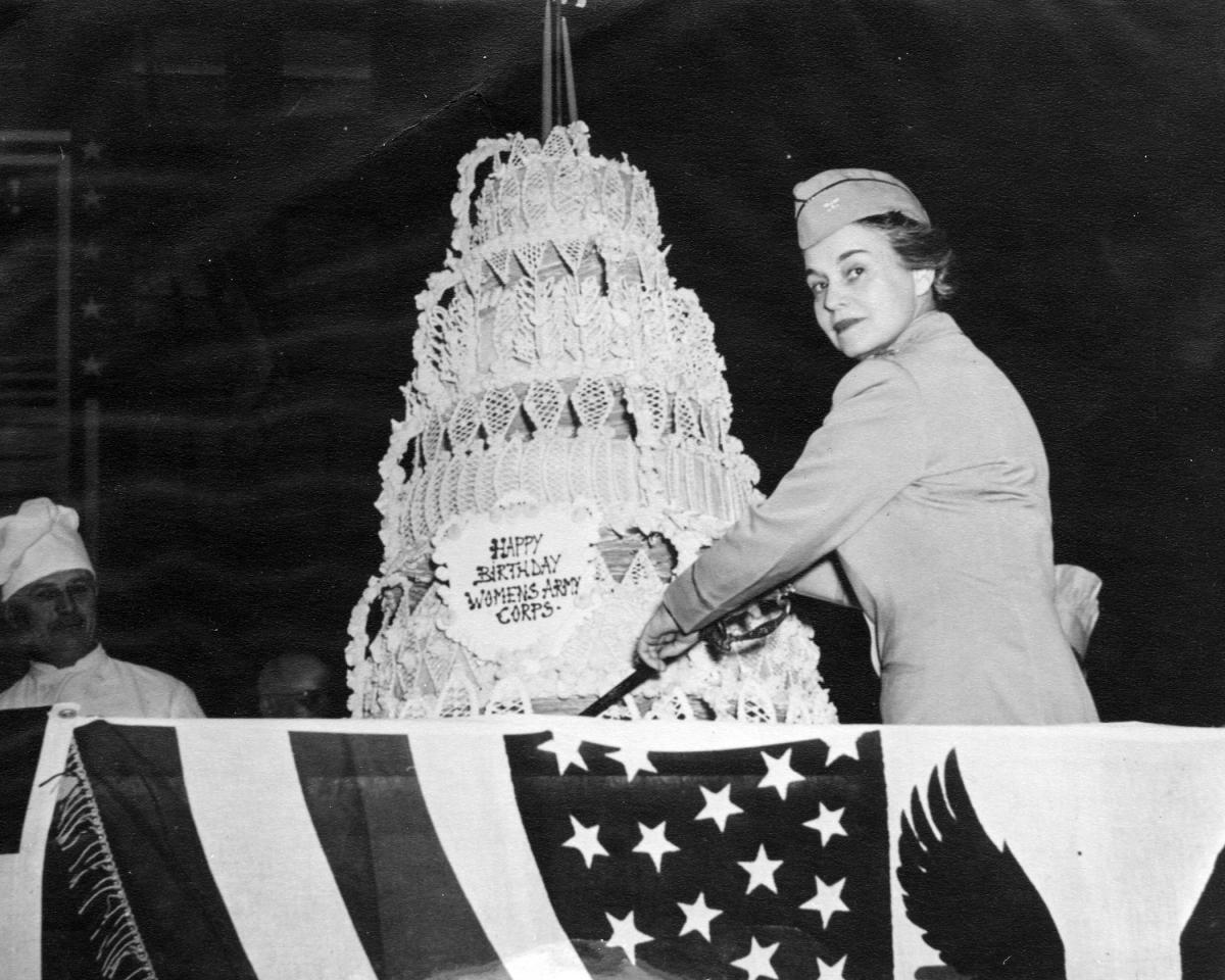 Mrs. Oveta Culp Hobby cuts the cake for the Women’s Army Corps birthday celebration in New York City. 1945
