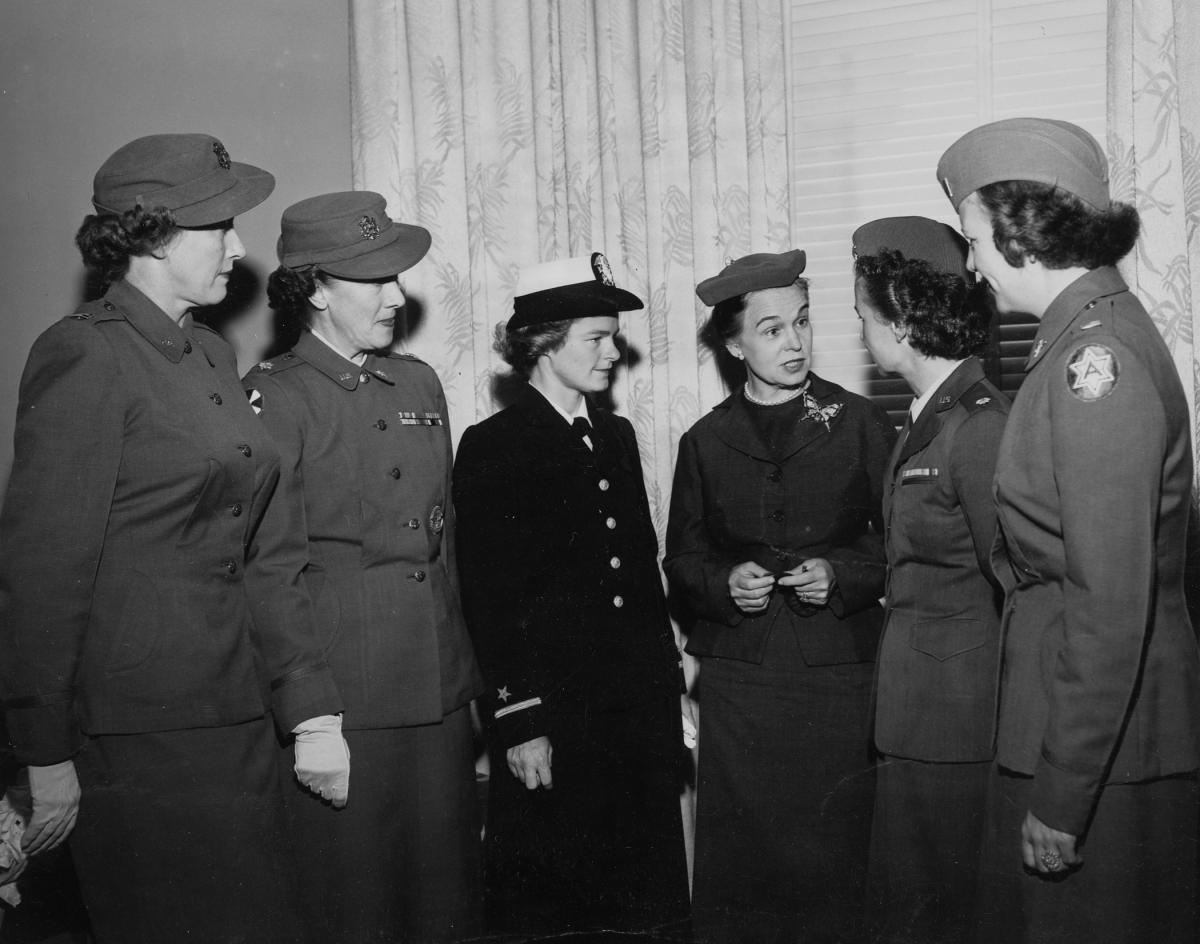 Women officers of the Armed Forces in the San Francisco Bay Area paid a courtesy call on Mrs. Oveta Culp Hobby at the Palace Hotel. Shown are: L to R Captain Gertude Murray, Major Harriet N. Moses, Ensign Susie Brossy, Hobby, Lt. Colonel Kathleen McClure, and 1st Lt. Betty Lou Simson. September 1, 1953