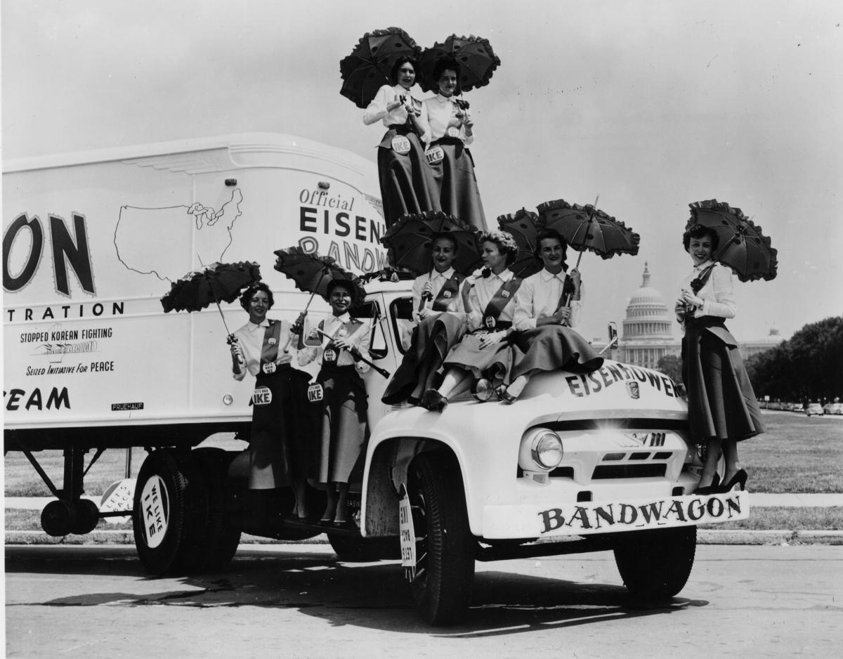 Langhorne Washburn Papers. Philadelphia Ike Girls pose on the official Citizens for Eisenhower Bandwagon as it leaves Washington, D.C. for a nationwide tour promoting various Republican congressional candidates. October 17, 1954.