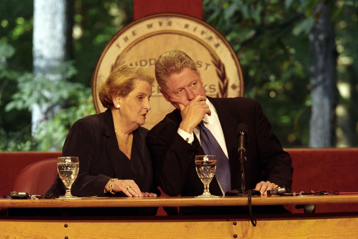 President Clinton and Secretary of State Madeleine Albright Talk During the Wye River Plenary Session near Queenstown, Maryland. October 15, 1998. Photo by Sharon Farmer.