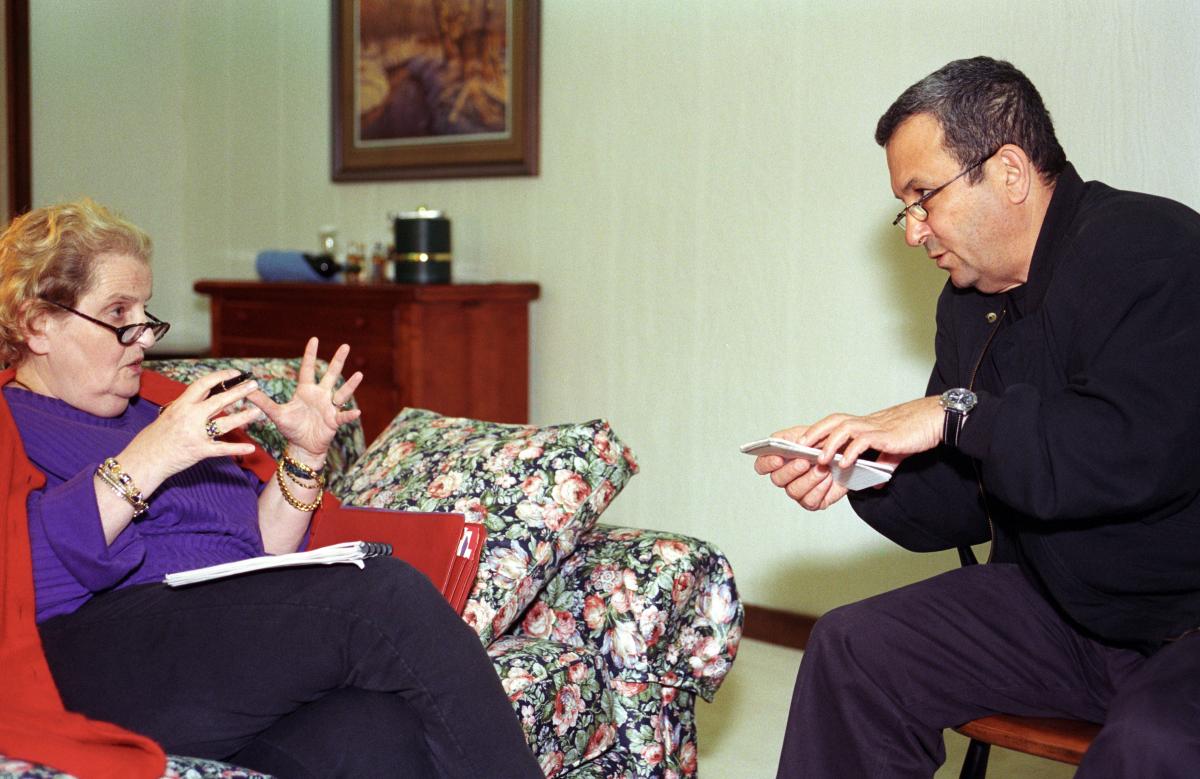 Secretary of State Madeleine Albright and Prime Minister Ehud Barak of Israel Talk During Middle East Negotiations at Camp David. July 13, 2000. Photo by David Scull.