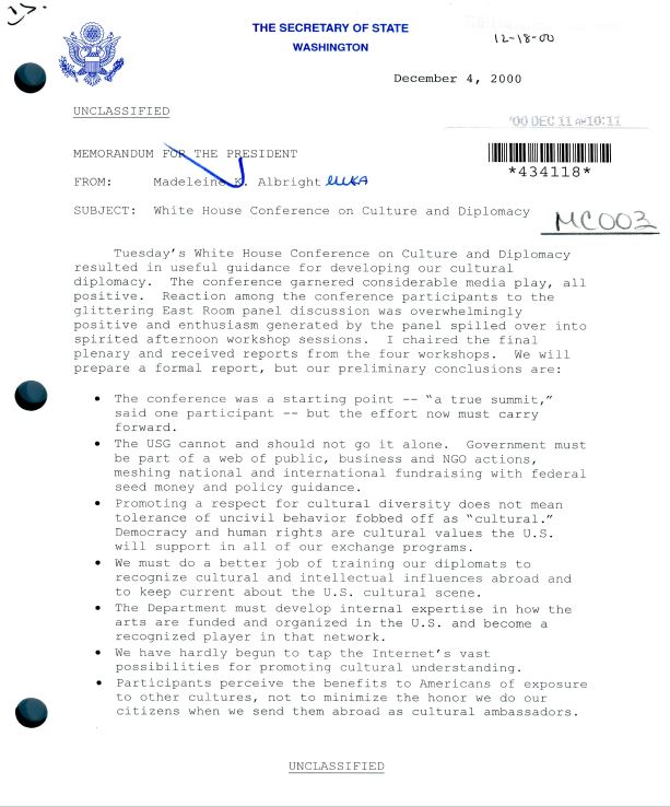 Toward the end of his administration and her tenure as Secretary of State, Albright sent President Clinton a memo summarizing her preliminary conclusions from the “White House Conference on Culture and Diplomacy.” She reports that the December 2000 conference was well received. Secretary Albright states that in her closing remarks, she stressed that the conference “signals a determination to put cultural understanding and exchange at the center of our diplomatic efforts.”