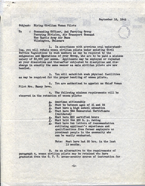 Memo regarding Hiring Civilian Women Pilots, September 15, 1942 [Jacqueline Cochran Papers, WASP Series, Box 12, Establishment of WASP]