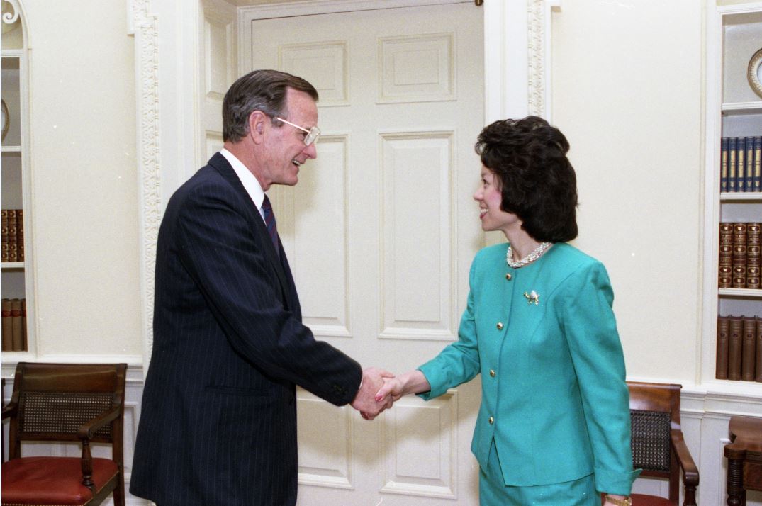President Bush greets Elaine Chao and her family in the Oval Office, 16 May 1989. Photo Credit: George Bush Presidential Library and Museum