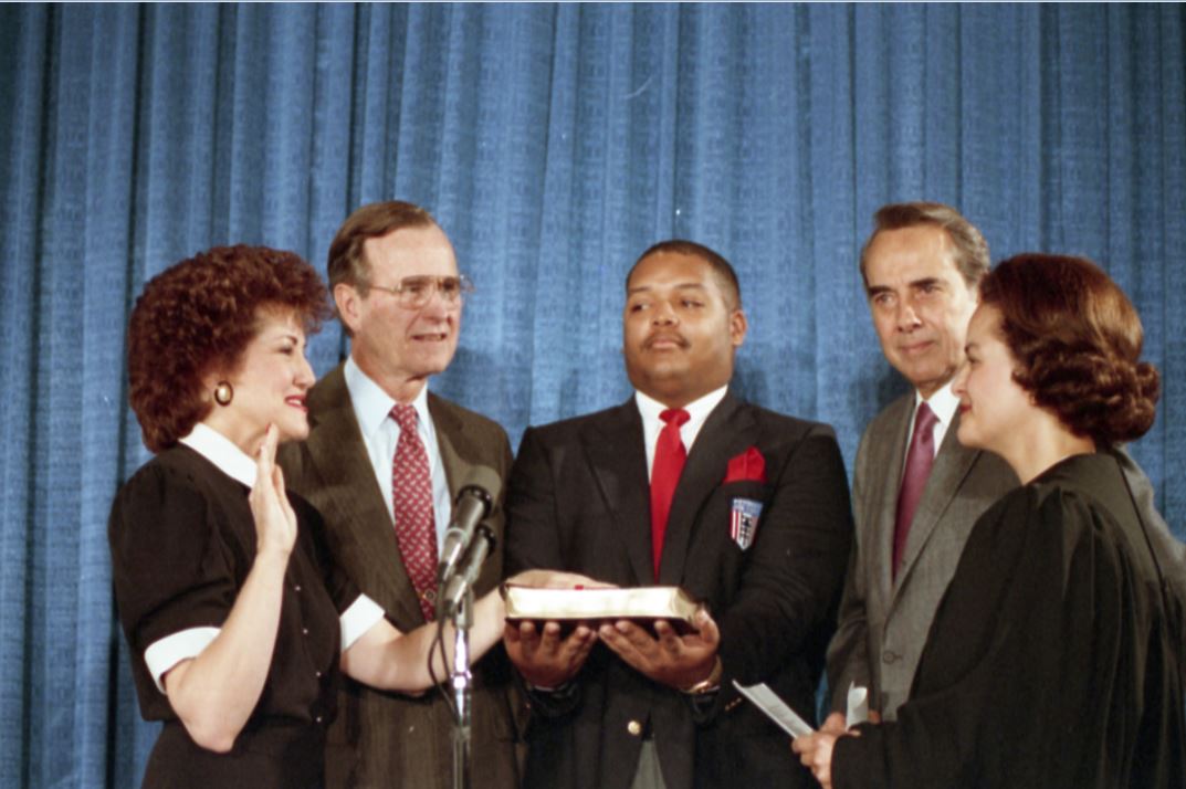 President Bush participates in the swearing-in ceremony for Elizabeth Dole as Secretary of Labor. President Bush and Senator Robert Dole look on, as Judge Judith Rogers, Chief Justice, DC Court of Appeals, administers the oath. Anthony Bond, holds the Bible, 30 January 1989. Photo Credit: George Bush Presidential Library and Museum