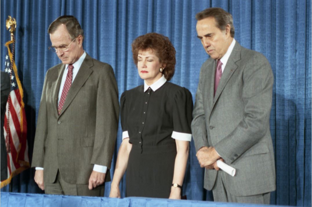 President Bush, Elizabeth Dole, and Senator Robert Dole bow their heads in prayer before Elizabeth Dole is sworn-in as Secretary of Labor. 30 January 1989. Photo Credit: George Bush Presidential Library and Museum
