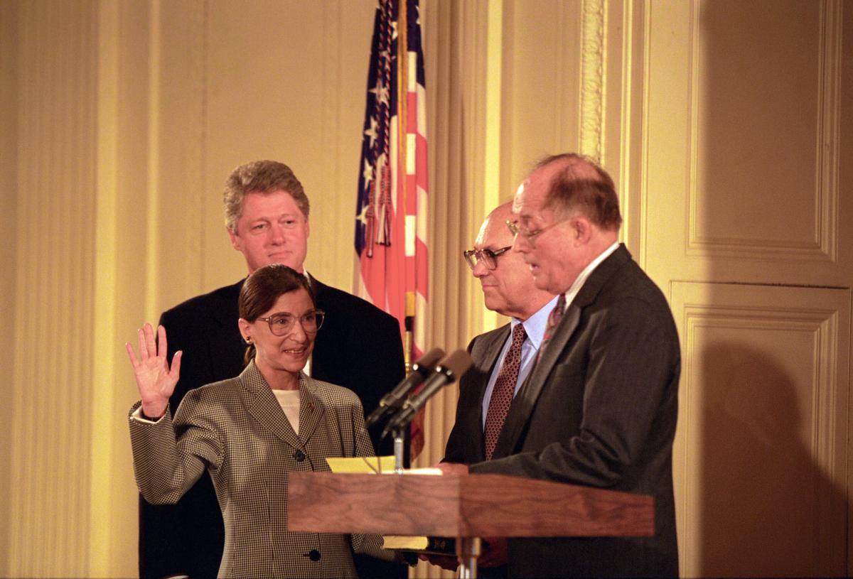 Chief Justice William Rehnquist Administers the Oath of Office to Judge Ruth Bader Ginsburg as Associate Supreme Court Justice at the White House on August 10, 1993. Photo by Ralph Alswang.