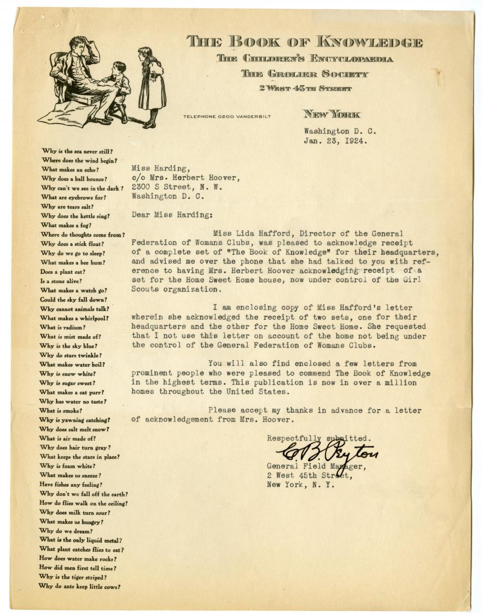Lou Hoover attended to the furnishings of the Little House including selecting books for the library. This letter from The Grolier Society confirms delivery of the initial donation of a twenty-volume encyclopedia for children.
