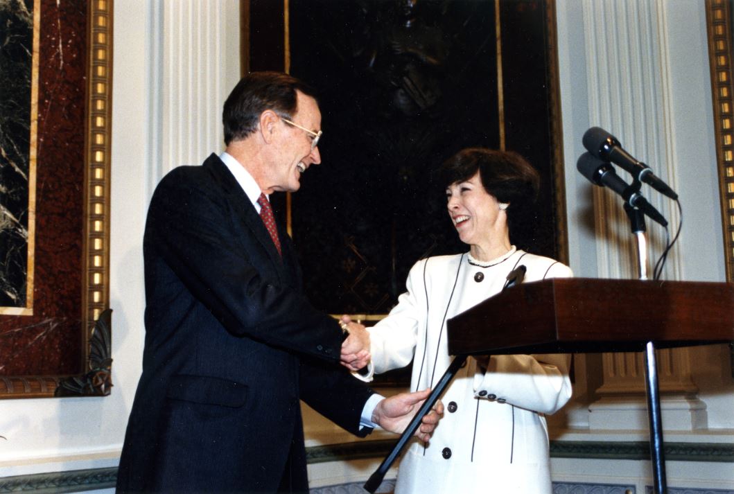 President Bush attends the swearing-in ceremony for Carla Hills, U.S. Trade Representative. Supreme Court Justice Antonin Scalia performs the ceremony, 06 February 1989. Photo Credit: George Bush Presidential Library and Museum