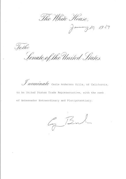 President George H.W. Bush nominated Carla Anderson Hills of California to be the US Trade Representative on January 20, 1989. Ambassador Hills was the first woman to serve as US Trade Representative after serving as President Ford’s Secretary of Housing and Urban Development. She is a Chairman Emeritus of the Council on Foreign Relations and is the Chair and Chief Executive Officer of Hills and Company International Consultants.