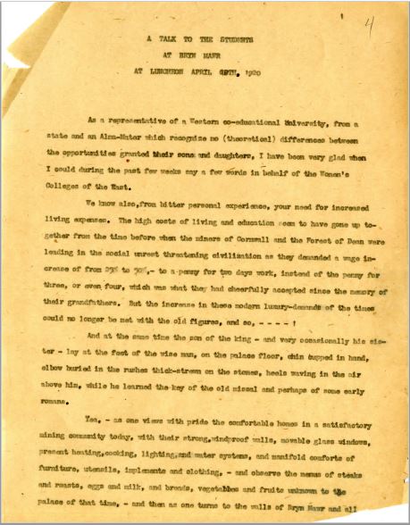 The 19th Amendment had been passed by Congress, but was not yet ratified when Lou Hoover gave her luncheon address to students at Bryn Mahr in the spring of 1920. She discusses at length the importance of teaching, education, and civic engagement. She stresses using the right to vote properly, as a way to effect.