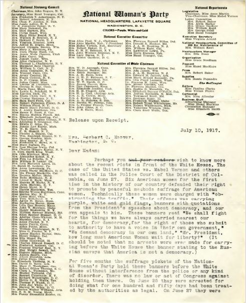 Anne Martin, a leader in the National Woman’s Party, describes suffragists being arrested at a White House protest in her letter to Lou Henry Hoover. Martin was a college classmate and friend of Lou Hoover. Her letters to Lou Hoover in 1911 and 1912 were often on suffrage letterhead, contained news clips on suffrage, and frequent reference to the amount of work to be done. Martin’s efforts were rewarded. By dint of the legislature voting in favor of suffrage in 1911 and 1913, Nevada women gained the right to vote in state elections in 1914.