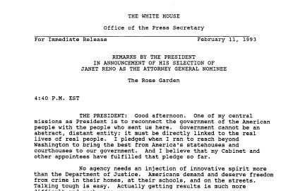 Reno delivers statements about her nomination and appointment as Attorney General. Clinton - Appointments [1] (Nomination of Reno: WJC remarks p. 30-31 , Reno remarks p. 31-32, Q&A p. 32-37, Reno bio p. 38; Swearing-in of Reno: WJC remarks page 67, Reno remarks p. 68). National Security Council, Office of Press and Communications, and Philip "PJ" Crowley, “Clinton - Appointments [1]